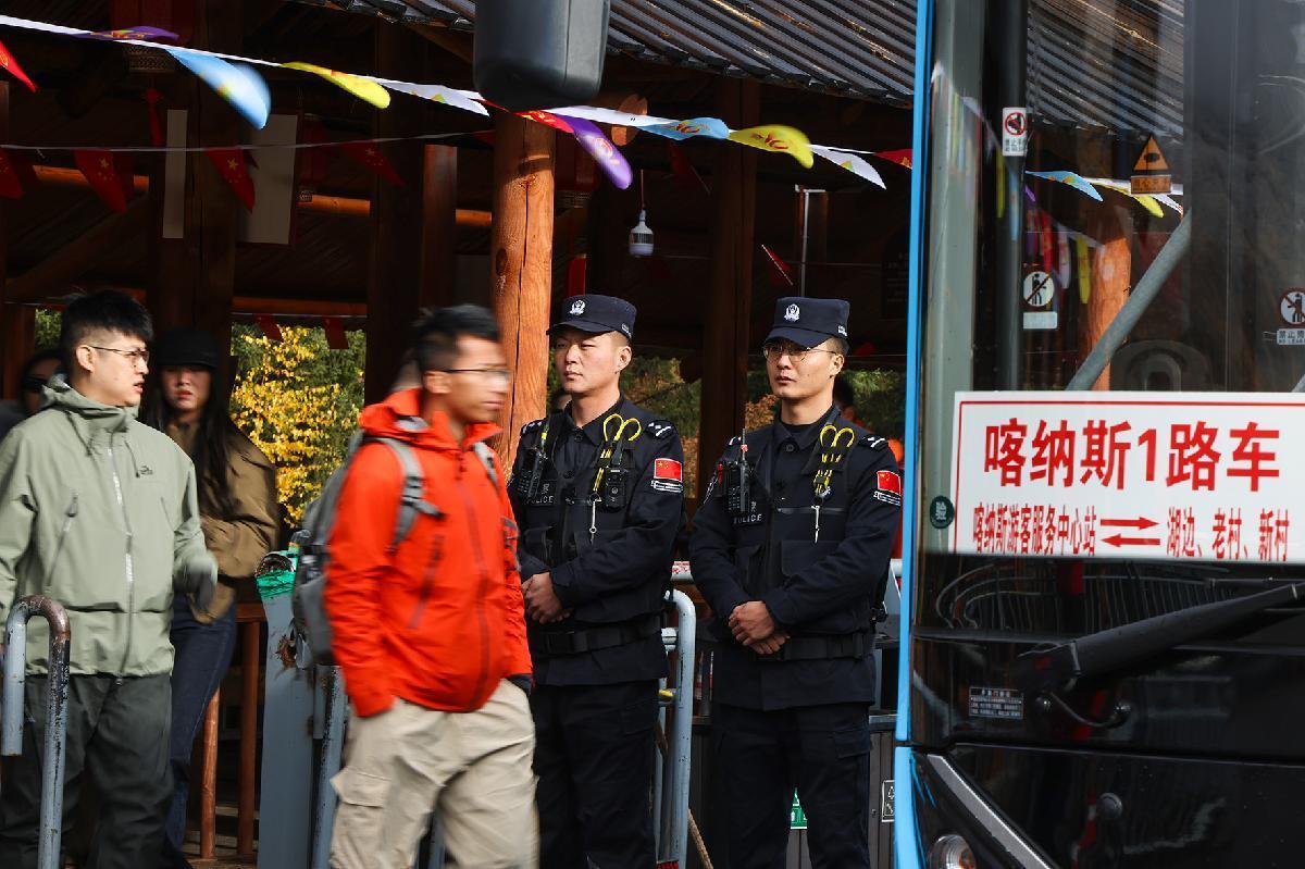 10月2日,新疆阿勒泰邊境管理支隊喀納斯邊境派出所民警在喀納斯景區(qū)換乘中心執(zhí)勤。