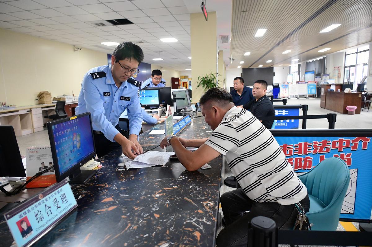 10月1日,安徽省固鎮(zhèn)縣公安局交管大隊民輔警在車管大廳為群眾辦理車駕管業(yè)務。