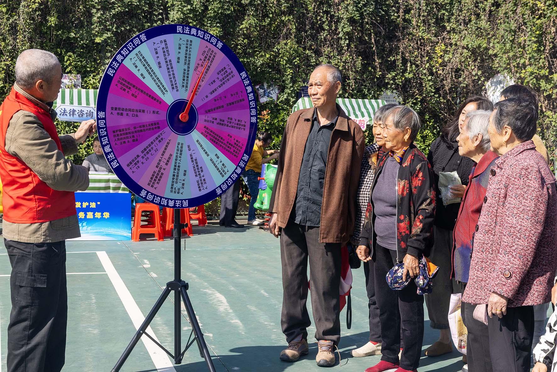 圖為普法志愿者給社區(qū)居民普及民法典知識。