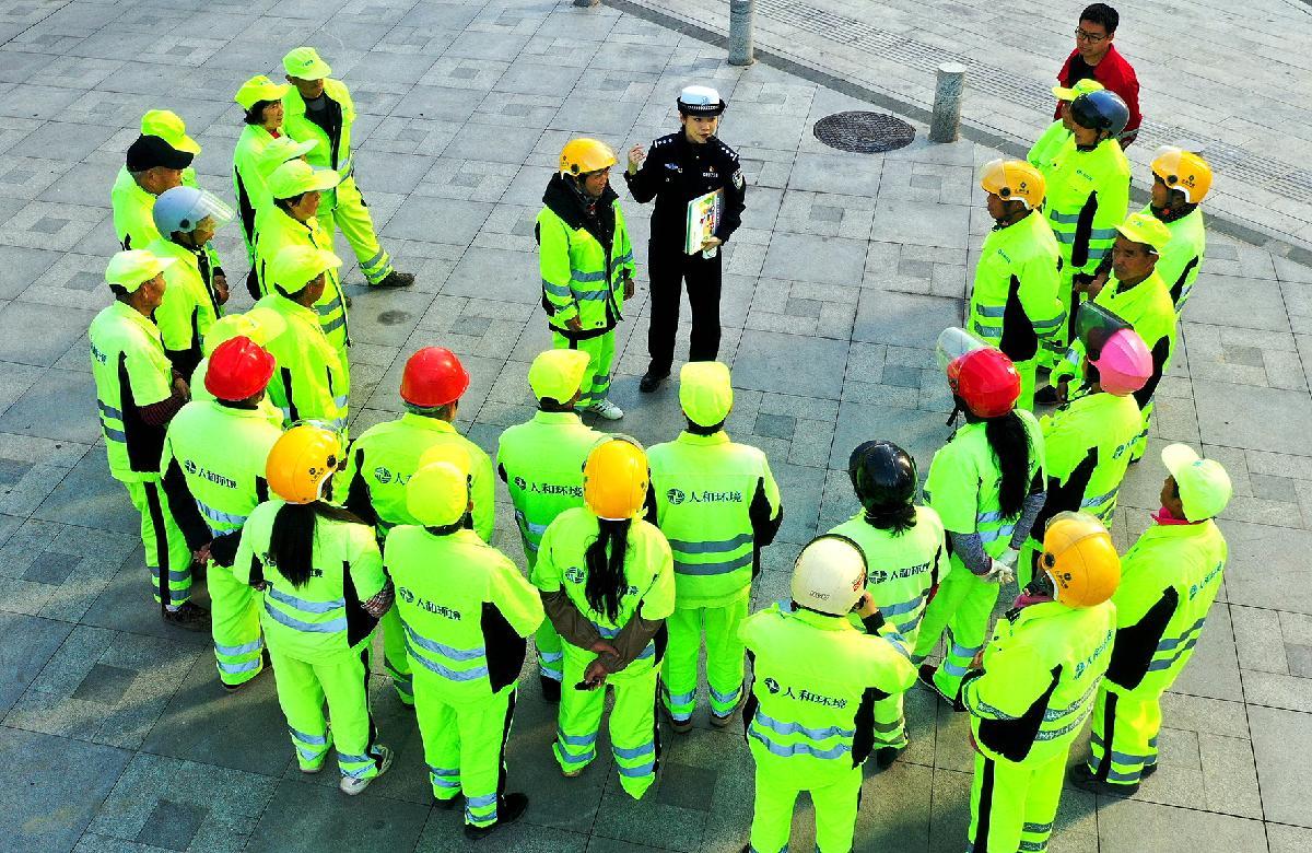 11月12日,安徽省舒城縣公安局交管大隊(duì)民警來到蘇塘公園入口,為30多名環(huán)衛(wèi)工人和環(huán)衛(wèi)車輛駕駛?cè)松狭艘惶蒙鷦?dòng)的道路交通安全法治教育課。