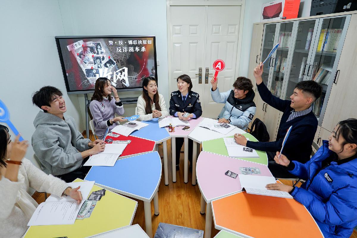 11月17日,山東省煙臺市公安局萊山分局民警在煙臺大學(xué)組織開展名為《收網(wǎng)》的劇本殺反詐宣傳,讓學(xué)生們通過角色扮演,在虛擬交鋒中錘煉現(xiàn)實(shí)防騙能力。