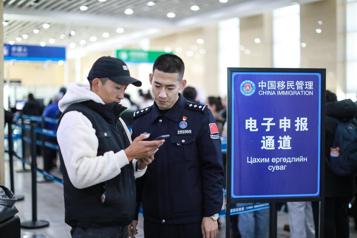 圖為二連出入境邊防檢查站移民管理警察協(xié)助蒙古國(guó)旅客網(wǎng)上填報(bào)外國(guó)人入境卡。