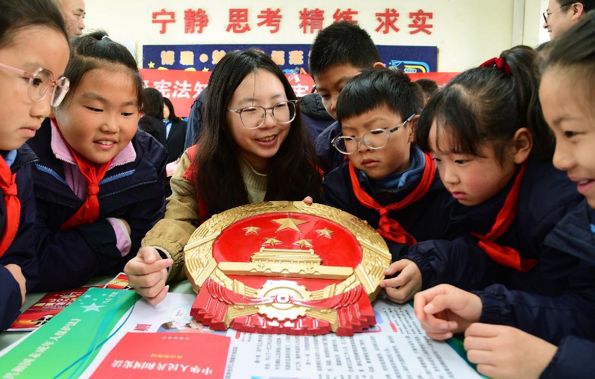 12月3日,在山東省棗莊市市中區(qū)文化路小學(xué),棗莊市市中區(qū)人民法院法官為學(xué)生講解憲法知識。