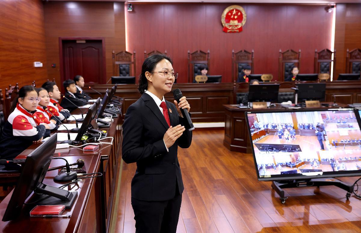 圖為法官為小學(xué)生講解庭審程序。