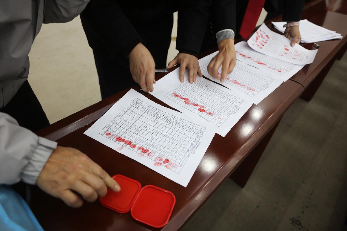 村民在領(lǐng)款手續(xù)上簽字捺手印。