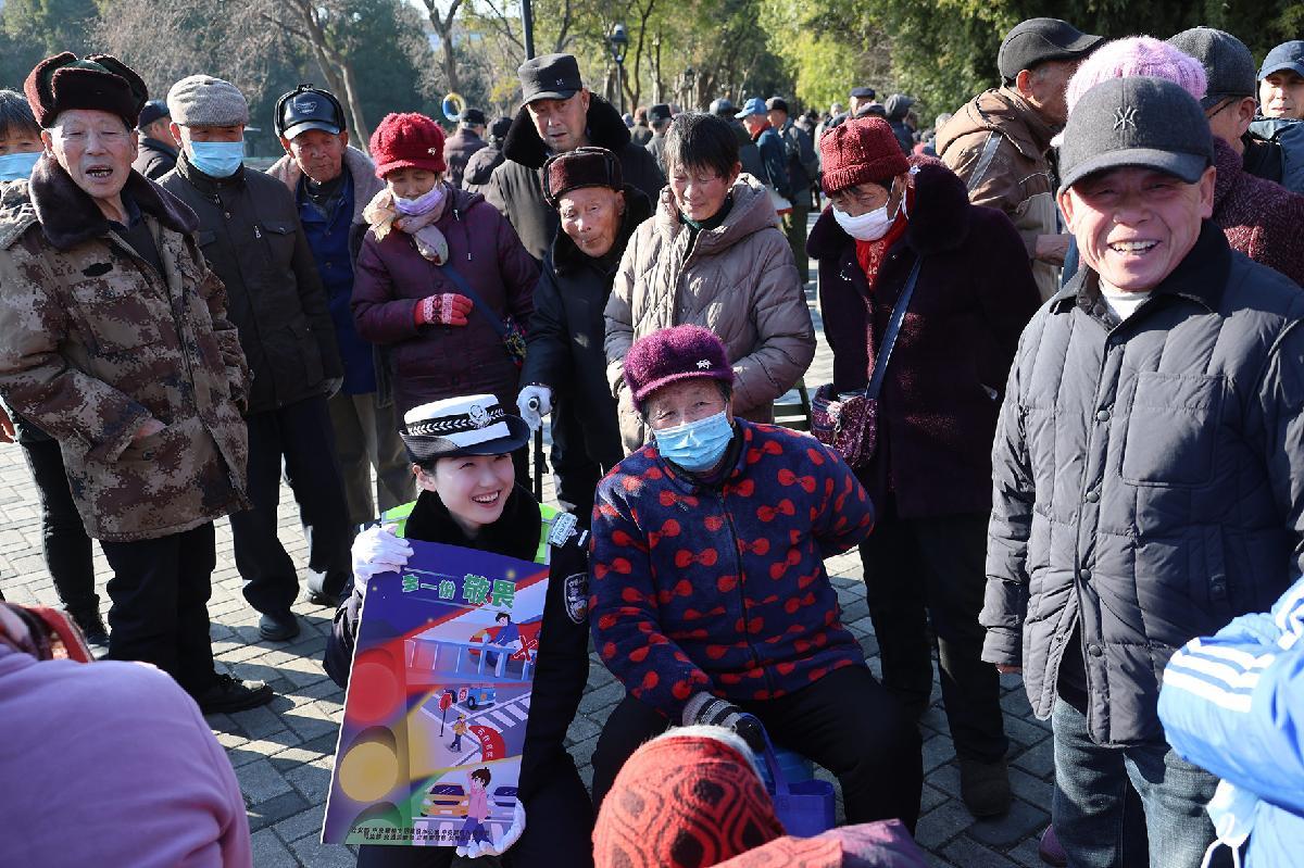 1月7日,在第六個中國人民警察節(jié)到來之際,安徽省巢湖市公安局交管大隊民警走進老年人休閑聚集地洗耳池公園,開展交通安全主題宣傳。