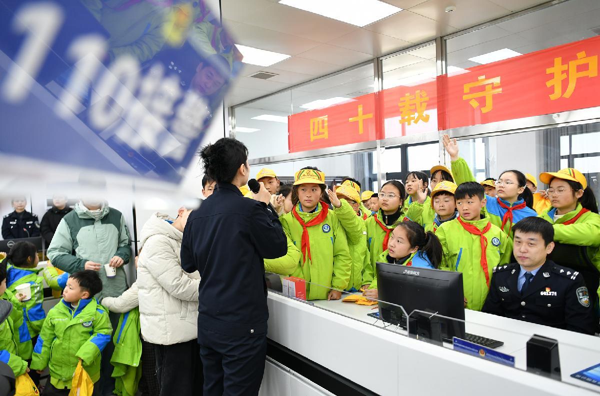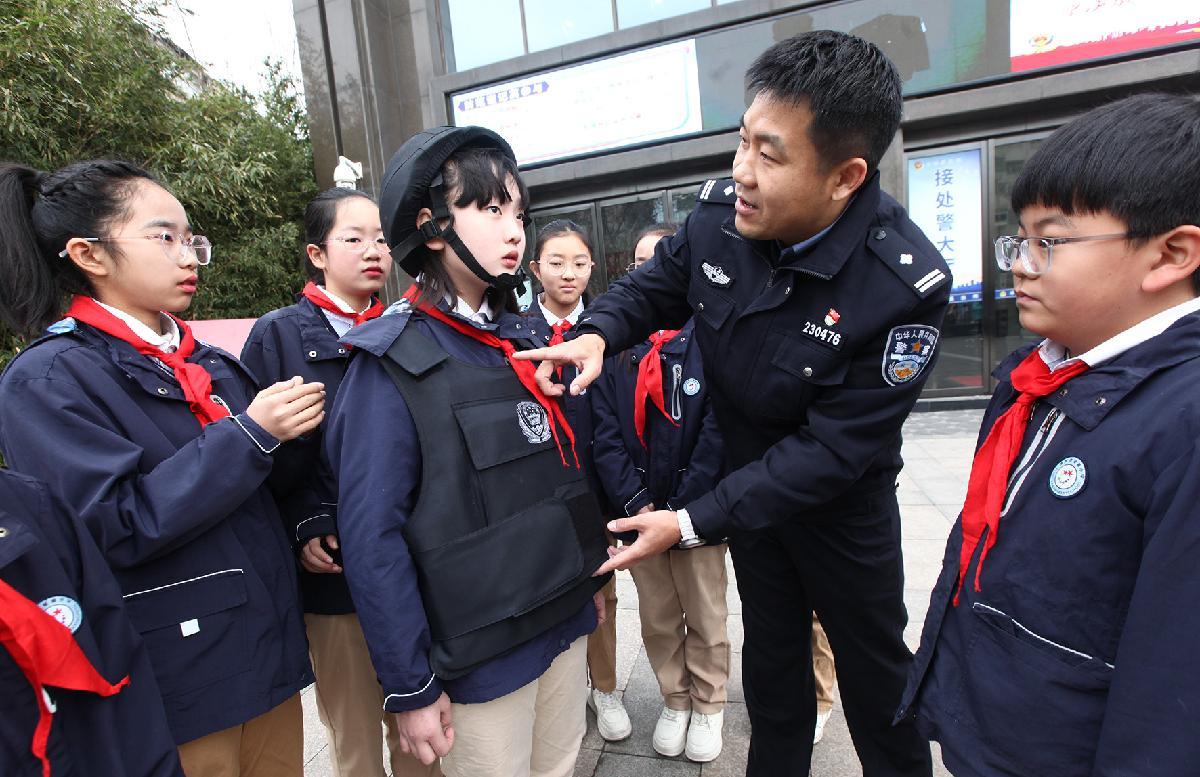 1月9日,江蘇省徐州市公安局鼓樓分局豐財派出所民警給小學(xué)生介紹警用裝備知識。當(dāng)日,徐州市星源小學(xué)組織學(xué)生到豐財派出所參觀,了解警營文化,感受警察風(fēng)采,喜迎中國人民警察節(jié)。