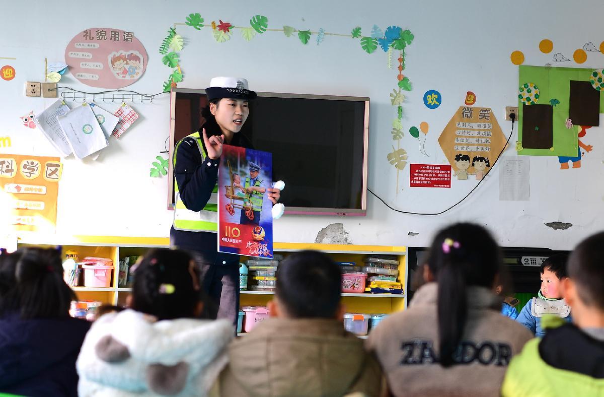 1月8日,第六個中國人民警察節(jié)前夕,安徽省巢湖市公安局交管大隊民警走進(jìn)轄區(qū)幼兒園,為小朋友們講解“中國人民警察節(jié)”的由來及道路交通安全知識。