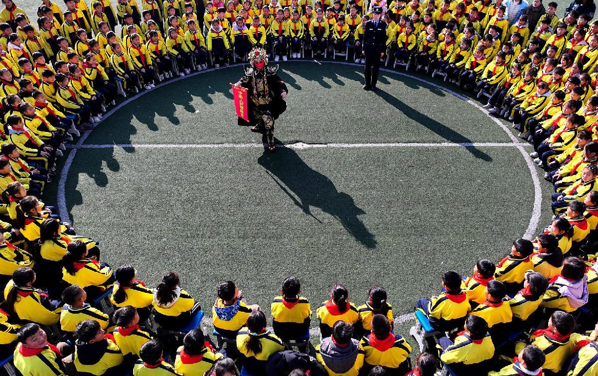 1月9日,在山東省棗莊市市中區(qū)齊村鎮(zhèn)渴口中心學(xué)校,棗莊市公安局市中分局一名輔警用“變臉”的表演方式向師生們宣傳法律知識。連日來,棗莊市公安局市中分局開展形式多樣的主題活動,迎接中國人民警察節(jié)的到來。