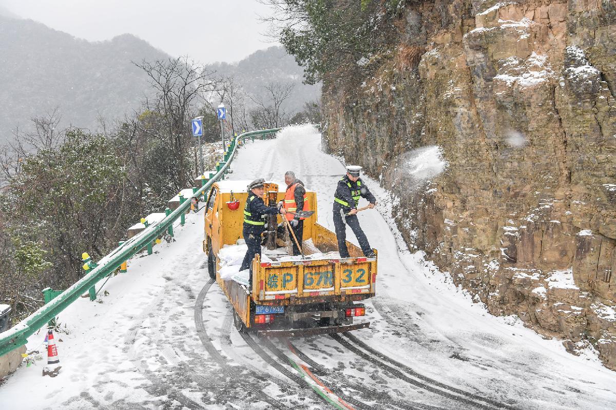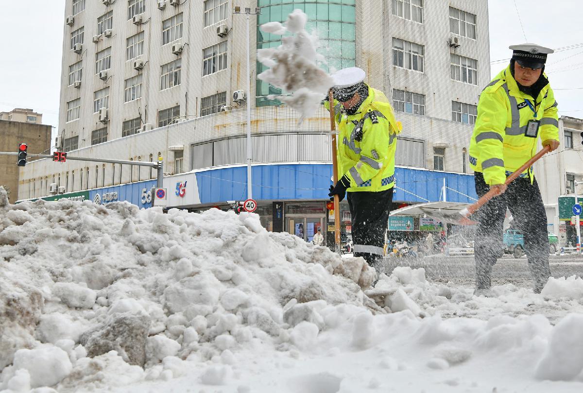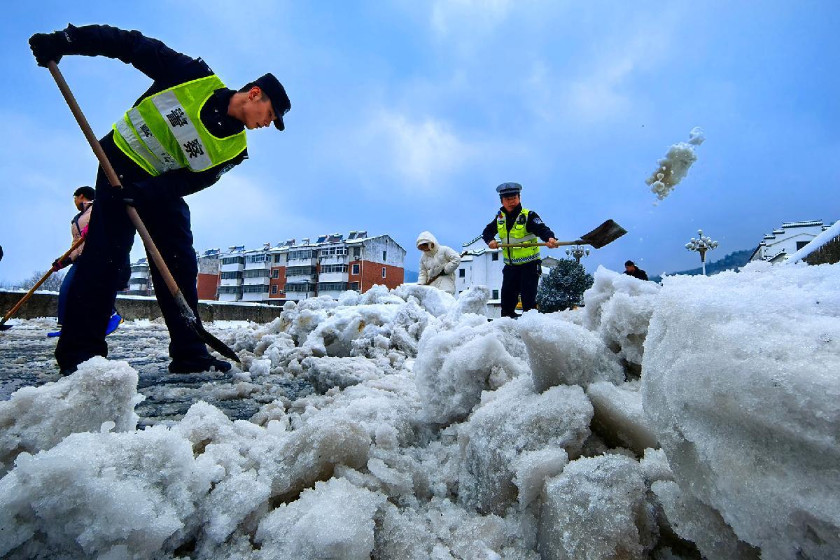 1月20日,安徽省阜南縣大范圍降雪。阜南縣公安、交通運(yùn)輸、城市管理等多部門聯(lián)動保障交通暢通。