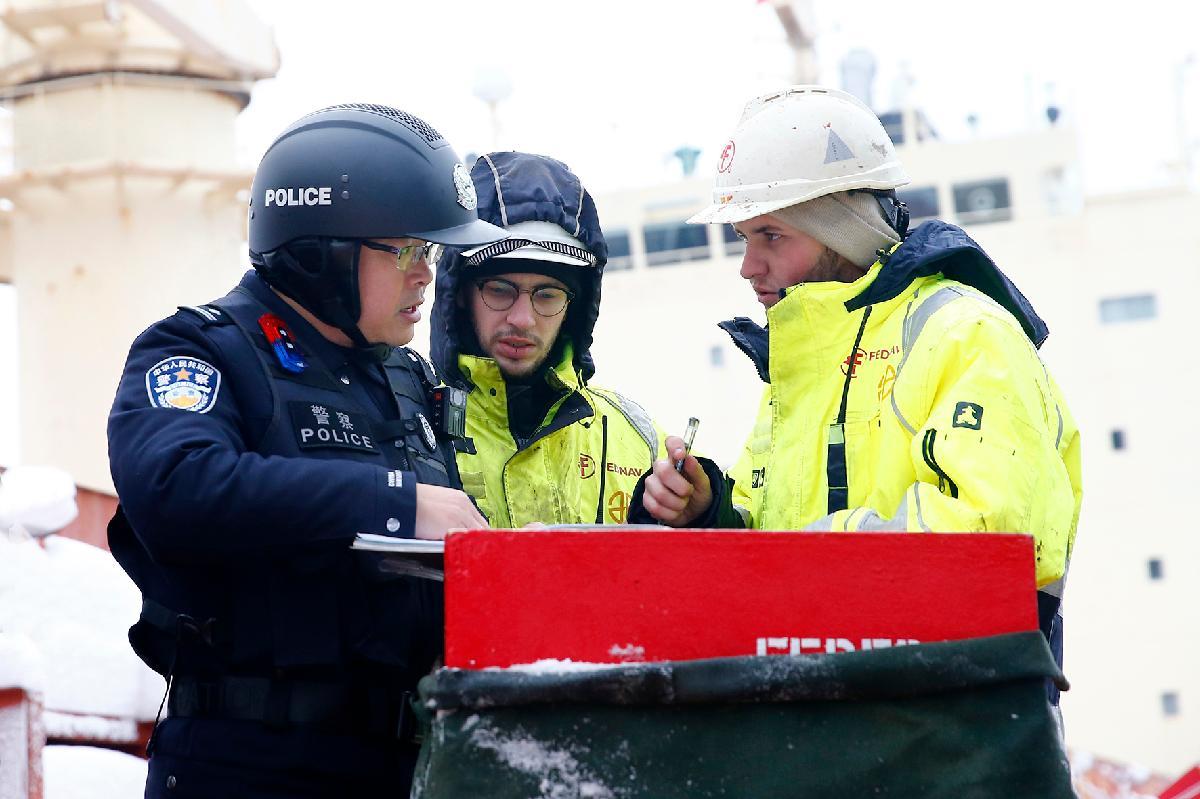 1月20日,南京港邊檢站執(zhí)勤民警登上停靠在新生圩港區(qū)401泊位的馬紹爾群島籍“高克斯”輪,向外籍船員進(jìn)行冰雪天氣安全作業(yè)提醒。