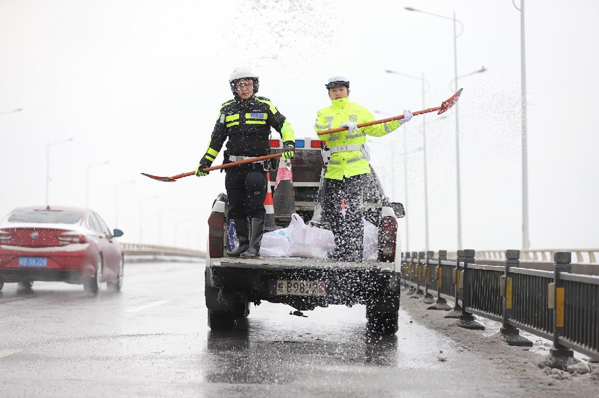 1月20日,安徽省巢湖市公安局交管大隊(duì)全警動員,全力應(yīng)對降雪、結(jié)冰天氣,加強(qiáng)路面交通安全管理,確保安全暢通。