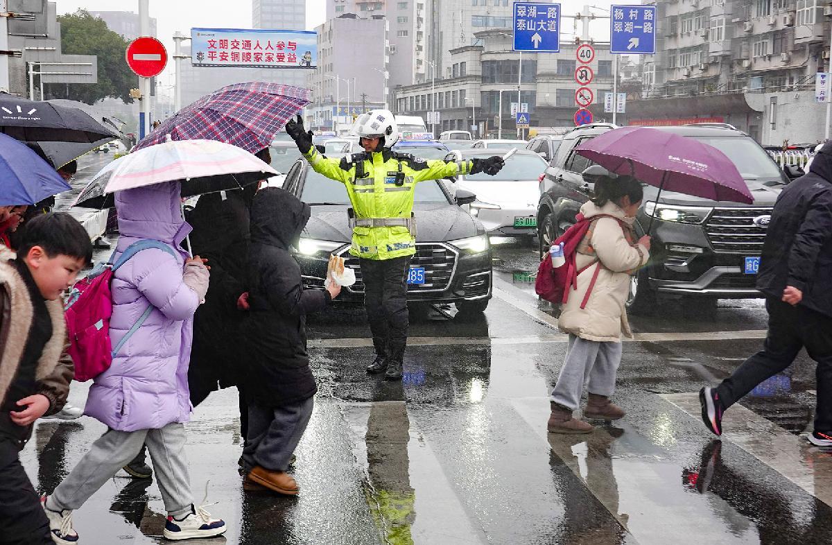 1月19日,安徽省銅陵市雨雪低溫天氣來襲。銅陵市公安局交管支隊(duì)立即啟動應(yīng)急預(yù)案,增派中小學(xué)?!白o(hù)學(xué)崗”警力,全力守護(hù)學(xué)生出行安全。