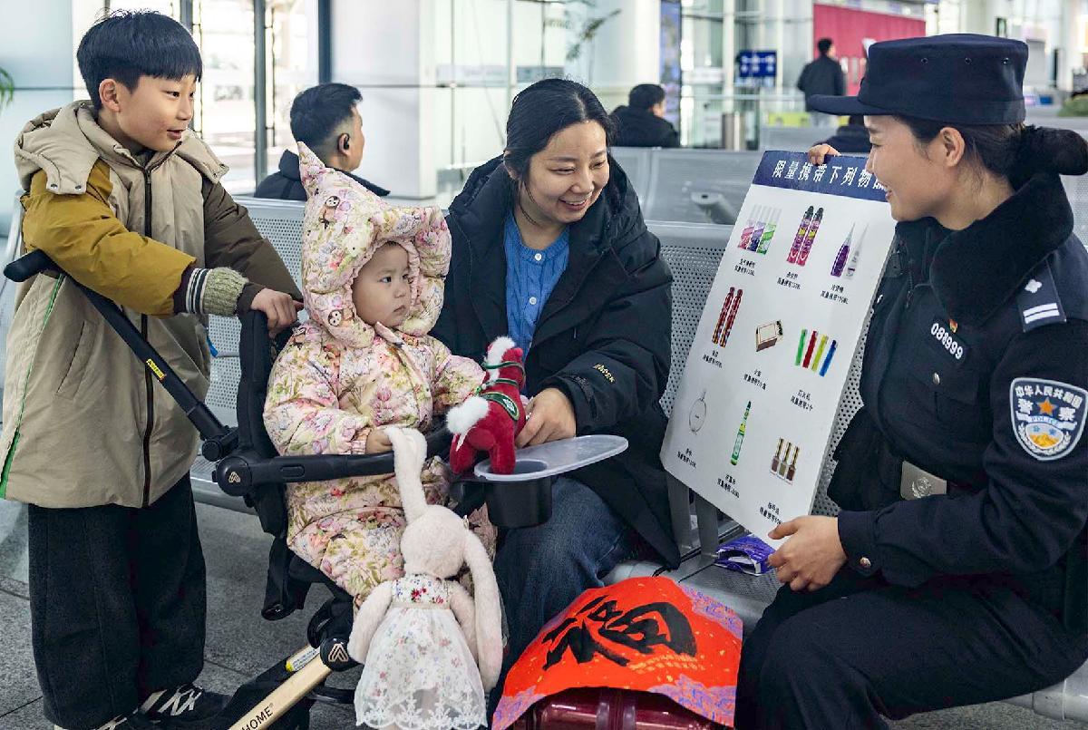 2月2日,南京鐵路公安處泰州站派出所民警為旅客講解鐵路安全知識。