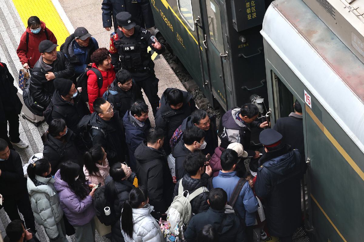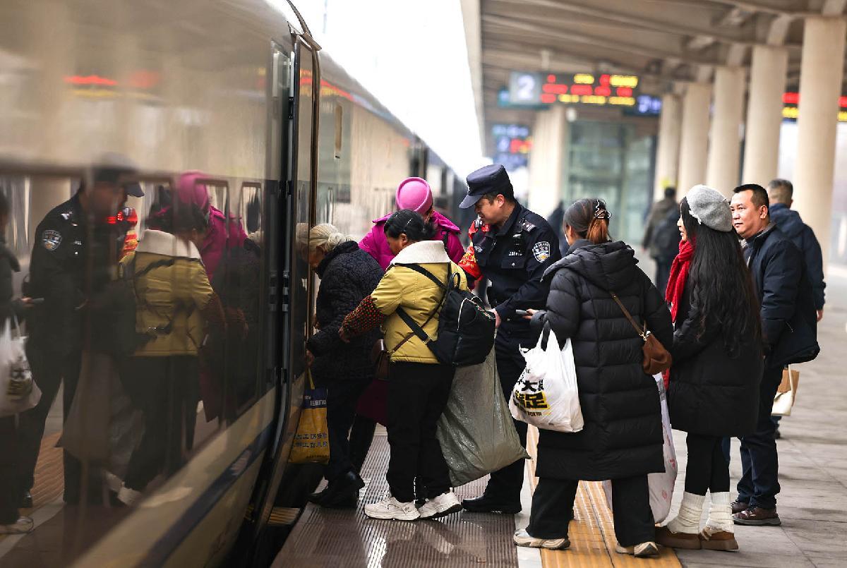 2月2日,在西安火車站站臺,西安鐵路公安處民警在維持乘車秩序。