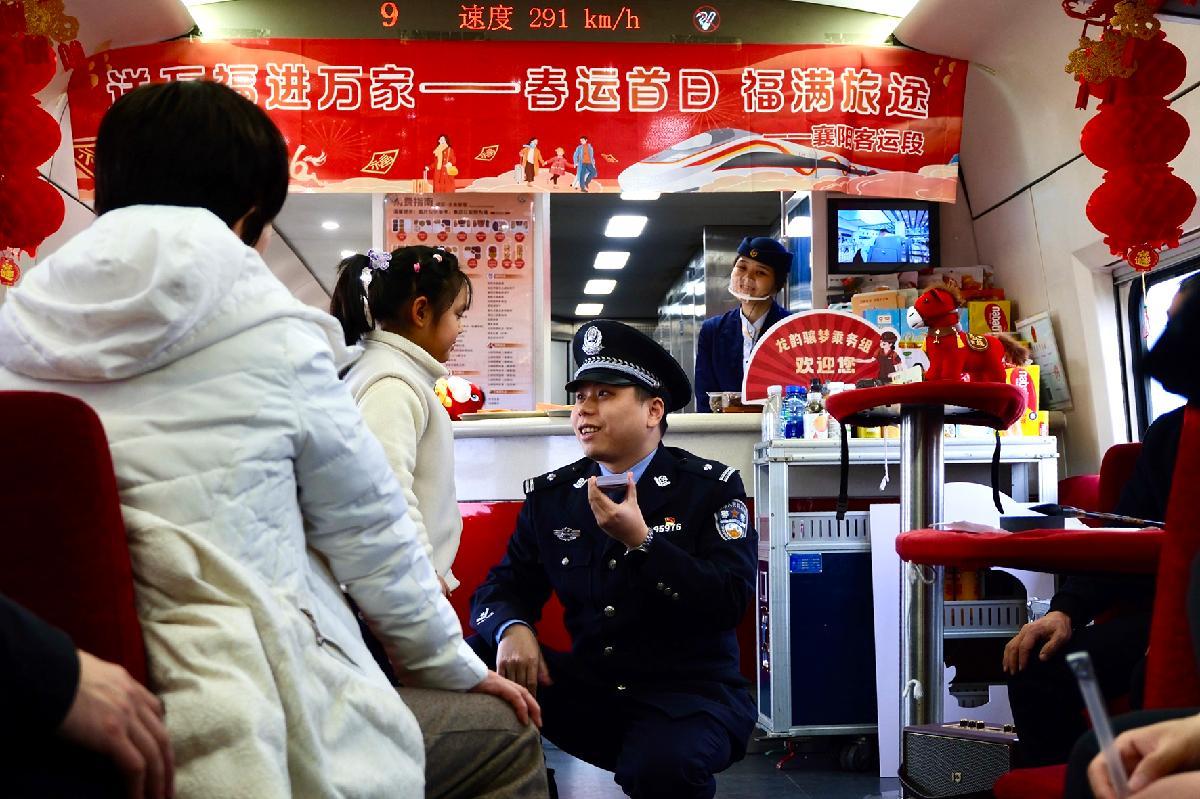 2月2日,襄陽鐵路公安處乘警支隊攜手襄陽客運段,在G6807次列車上開展春運首日安全宣傳。