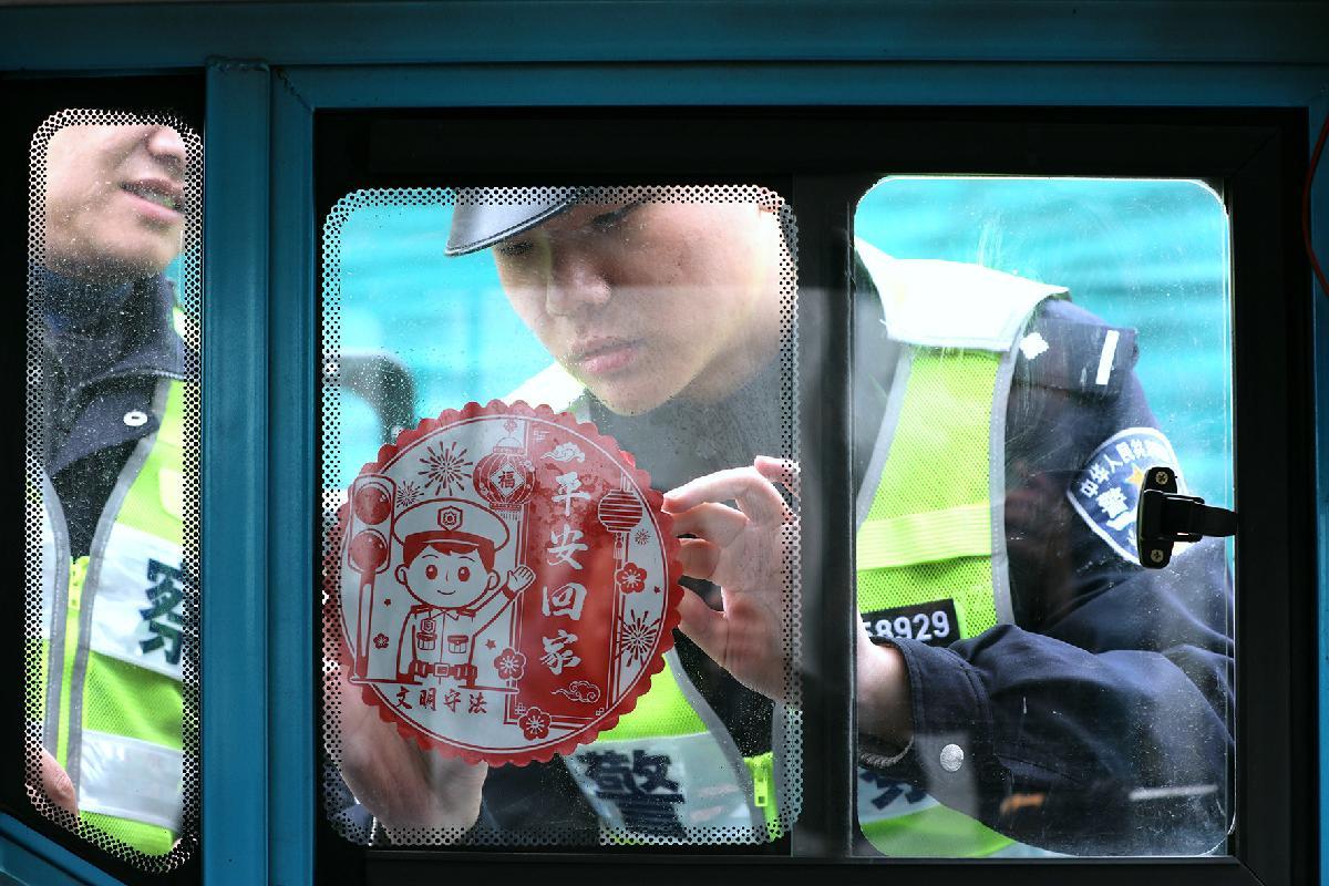 2月2日,安徽省寧國市公安局交管大隊執(zhí)勤民警向過往車輛發(fā)放“平安回家”窗花和“溫馨提示”單,將溫馨的新春祝福與安全提醒相結(jié)合,把一路平安的誠摯祝愿送給每位駕駛?cè)藛T。