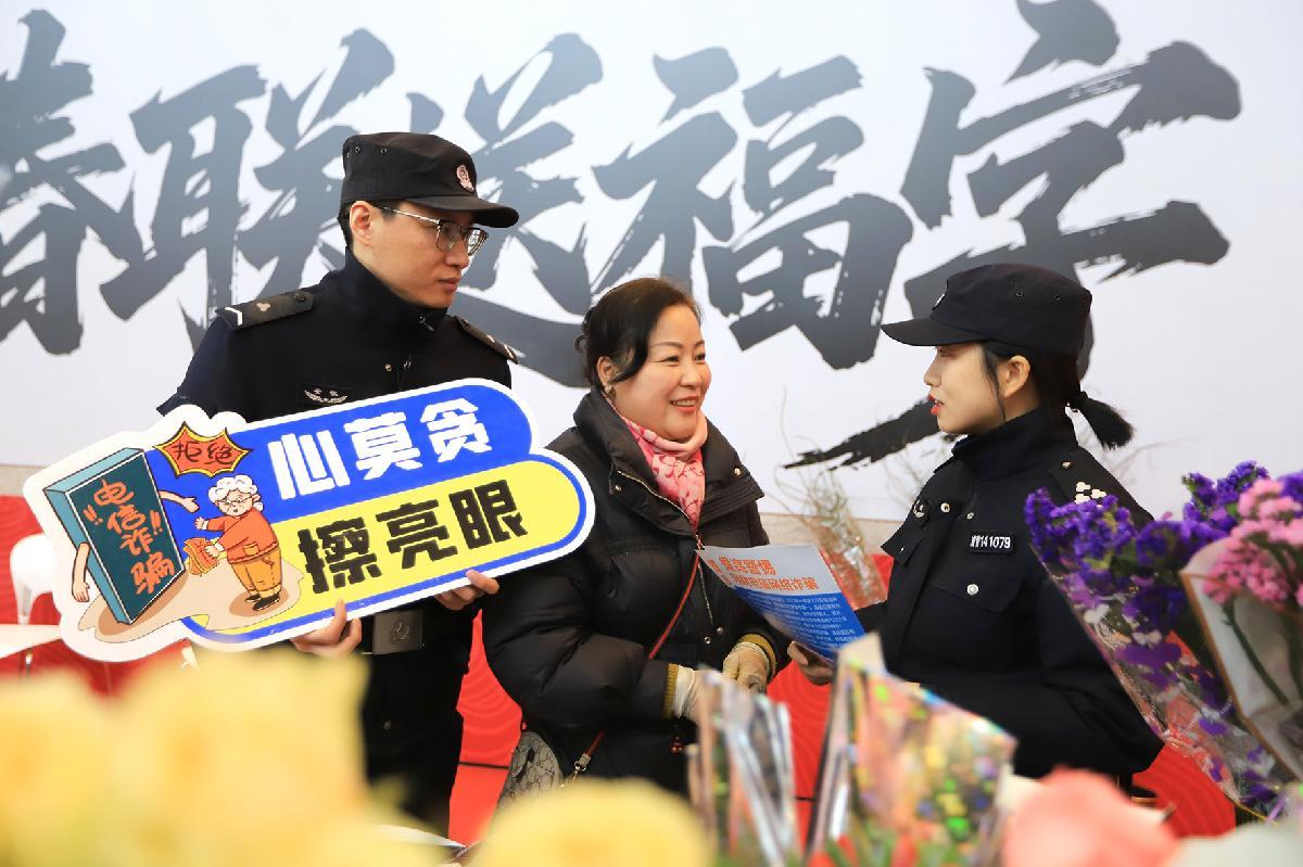 2月10日,農(nóng)歷小年。安徽省蕪湖市公安局弋江分局民輔警來到迎春年貨節(jié)市集,開展“賀新春 話反詐”安全知識宣傳。