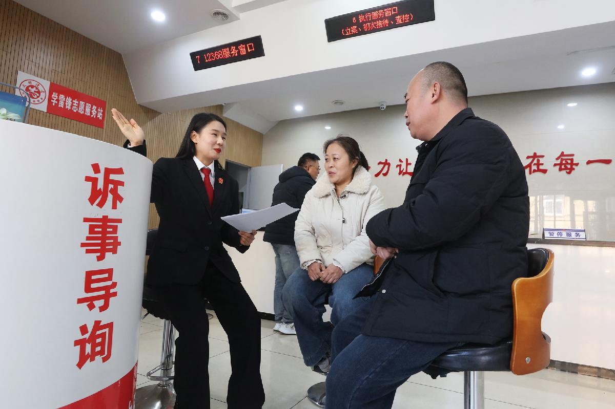 圖為訴訟服務(wù)大廳工作人員為前來辦事的群眾提供導(dǎo)訴服務(wù)。