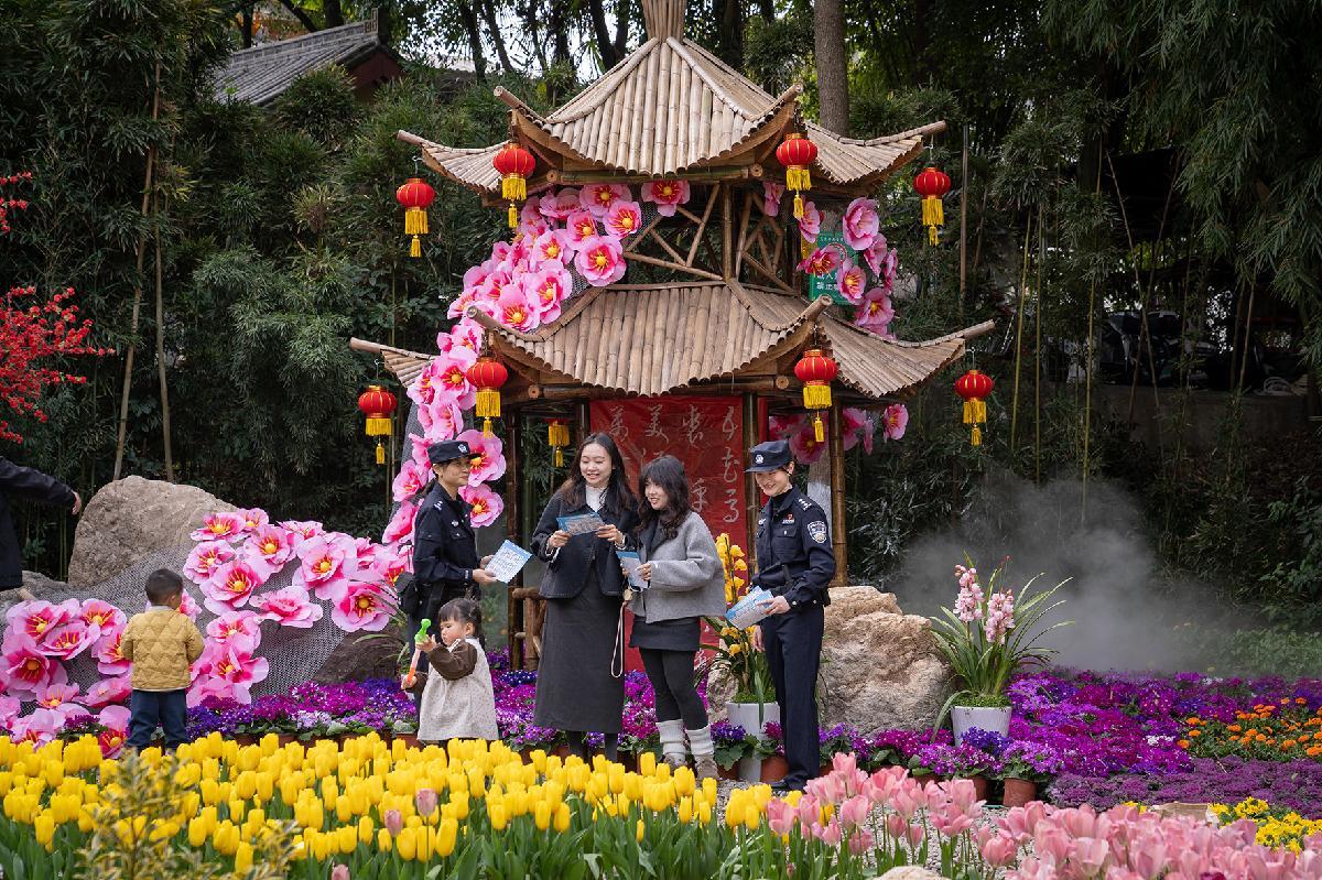 2月26日,四川省綿陽市公安局游仙區(qū)分局涪江派出所民警在富樂山公園向游客宣講反詐知識。