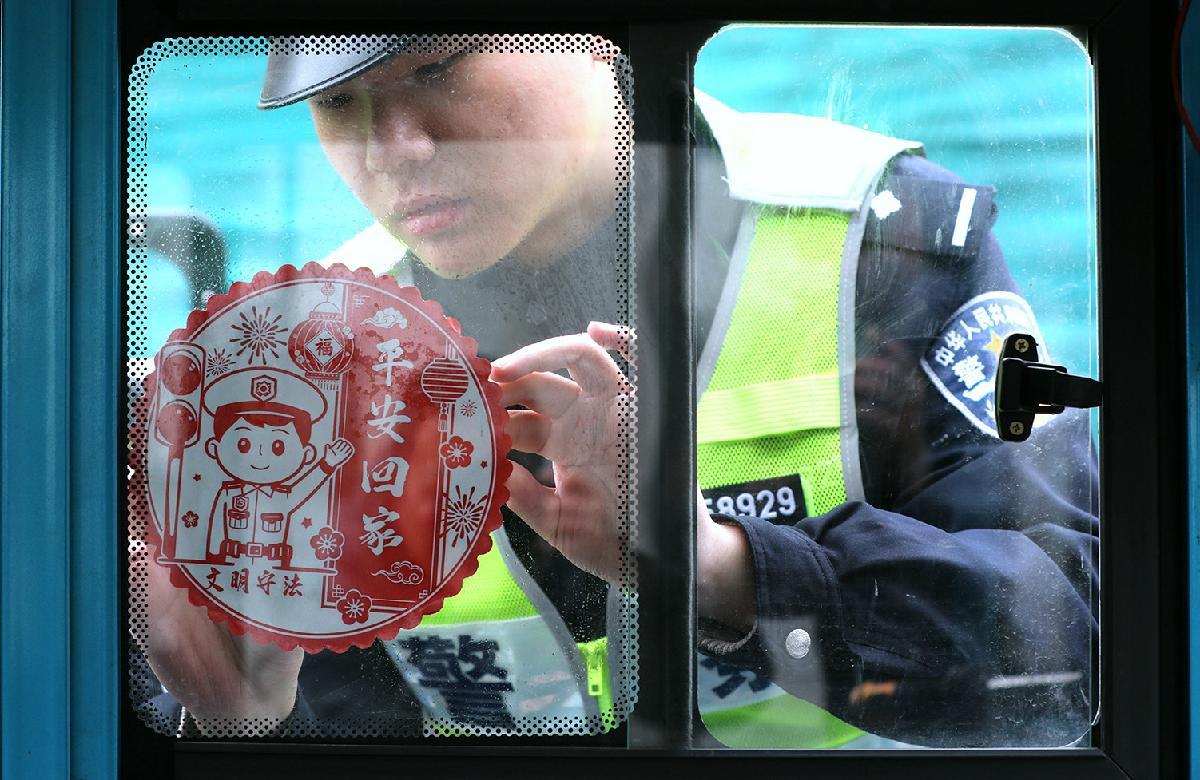 2月2日,是2026年春運(yùn)首日。安徽寧國(guó)市公安局交管大隊(duì)執(zhí)勤民警向過往車輛發(fā)放“平安回家”窗花和“溫馨提示”單,把一路平安的誠(chéng)摯祝愿送給每位駕駛?cè)藛T。