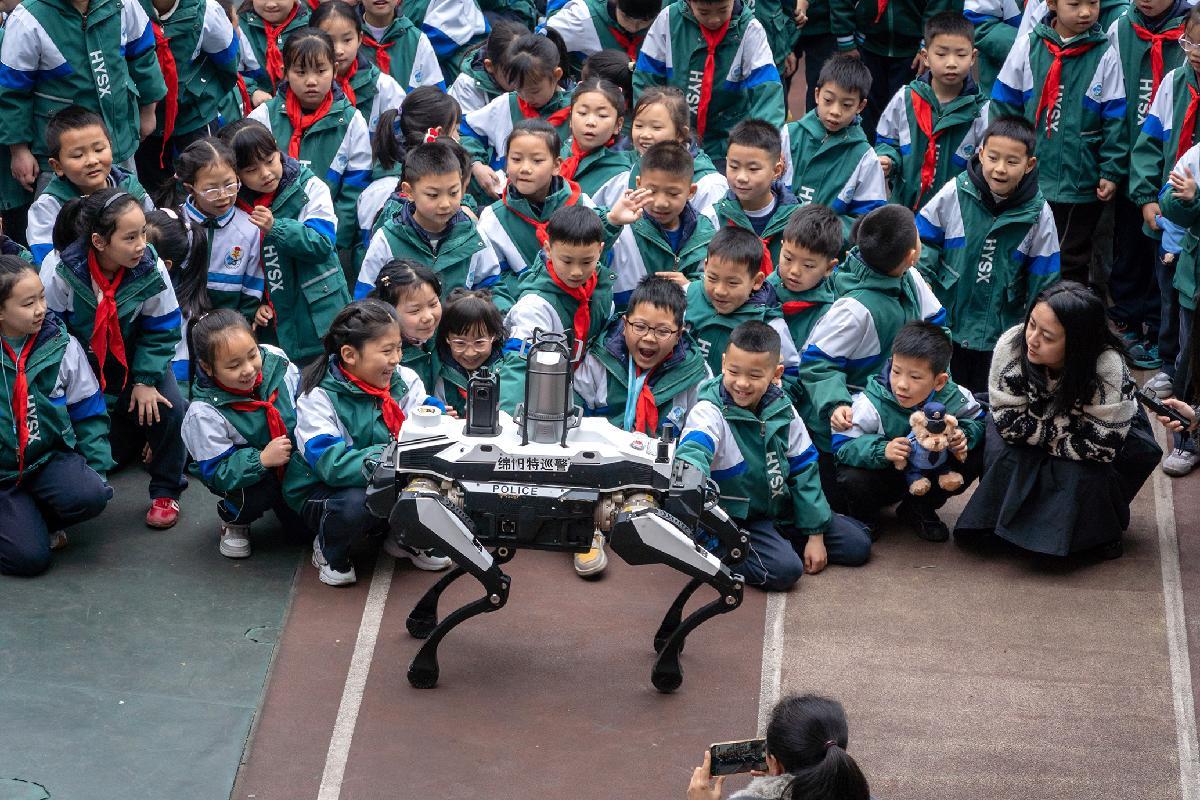 圖為警用機(jī)器狗與同學(xué)們進(jìn)行互動(dòng)。