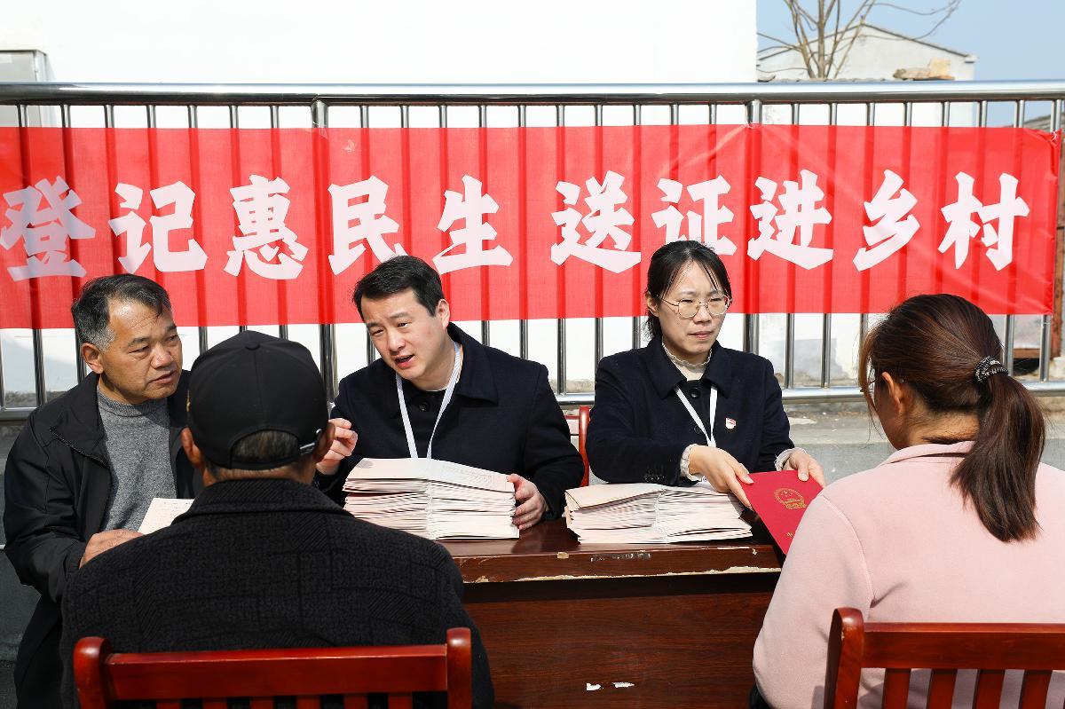 圖為3月23日,工作人員在烈山鎮(zhèn)南莊村將辦好的734本不動產(chǎn)權(quán)證書送到村民手中。