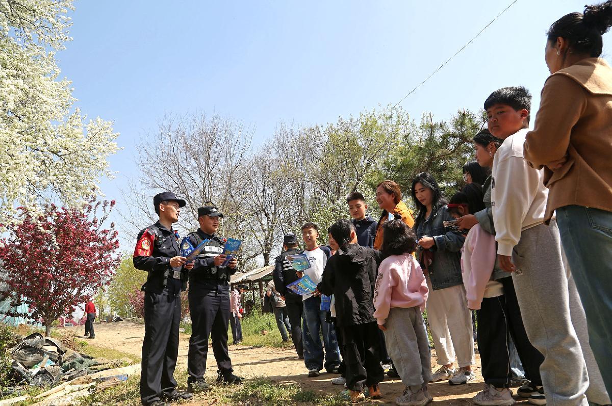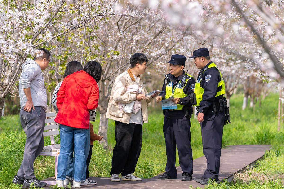 4月4日,上海市公安局崇明分局汲浜派出所民警在櫻花園進(jìn)行常態(tài)化巡邏,并向踏青賞花的游客普及防范電信網(wǎng)絡(luò)詐騙、交通出行安全等知識。
