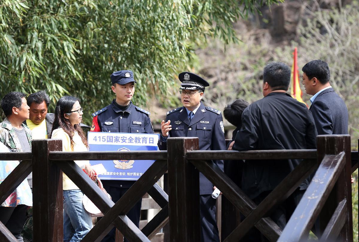 4月12日,在山東省臨沂市郯城馬陵山景區(qū),郯城縣公安局民警為游客普及國家安全知識。
