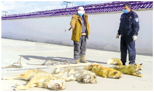 ▲ 3月2日,新疆維吾爾自治區(qū)克州邊境管理支隊木吉邊境派出所快速破獲一起捕殺販賣野生動物案,查獲已被獵殺的兩只狼、兩只狐貍。 本報記者 潘從武 本報通訊員 張佳 吳明賢 攝