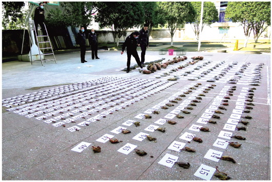 ▲ 1月23日至2月28日,湖南省森林公安機關(guān)共辦理涉及野生動物的刑事案件93起,抓獲犯罪嫌疑人97名,收繳野生動物5606頭(只)。圖為民警在清理繳獲的竹鼠、野豬、斑鳩等野生動物尸體。 本報記者 阮占江 本報通訊員 顏英華 攝