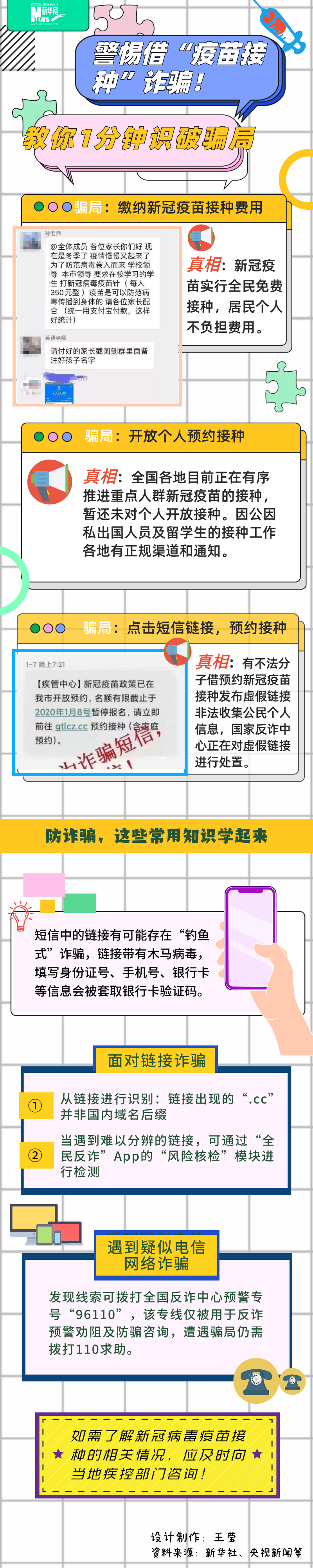 近期,全國(guó)多地有序開展新冠病毒疫苗接種,一些不法分子從中嗅到了“機(jī)會(huì)”,借疫苗接種設(shè)局實(shí)施詐騙,快來識(shí)破這些騙局!