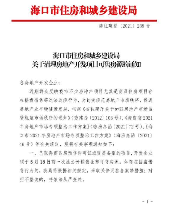 近日,海南省??谑凶》亢统青l(xiāng)建設(shè)局發(fā)布《關(guān)于清理房地產(chǎn)開(kāi)發(fā)項(xiàng)目可售房源的通知》。