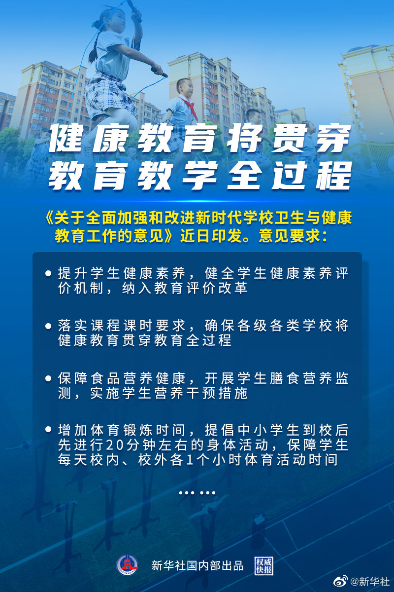 記者3日從教育部新聞發(fā)布會獲悉,《關(guān)于全面加強(qiáng)和改進(jìn)新時代學(xué)校衛(wèi)生與健康教育工作的意見》近日印發(fā)。意見要求,將健康教育與德育、智育、體育、美育、勞動教育相結(jié)合,融入教育教學(xué)、管理服務(wù)全過程。①提升學(xué)生健康素養(yǎng),健全學(xué)生健康素養(yǎng)評價機(jī)制,納入教育評價改革。②明確健康教育內(nèi)容。③落實課程課時要求,確保各級各類學(xué)校將健康教育貫穿教育全過程。④拓展健康教育渠道。⑤保障食品營養(yǎng)健康,開展學(xué)生膳食營養(yǎng)監(jiān)測,實施學(xué)生營養(yǎng)干預(yù)措施。⑥增加體育鍛煉時間,提倡中小學(xué)生到校后先進(jìn)行20分鐘左右的身體活動,保障學(xué)生每天校內(nèi)、校外各1個小時體育活動時間。⑦強(qiáng)化心理健康教育。⑧養(yǎng)成健康行為習(xí)慣。(記者胡浩,海報設(shè)計楊軼群)