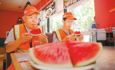 石家莊市橋西區(qū),環(huán)衛(wèi)職工正在“愛(ài)心驛站”里吃西瓜解暑。