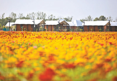 陜西省榆林市補(bǔ)浪河女子民兵治沙連營(yíng)區(qū)周邊,民宿坐落在花草之間。