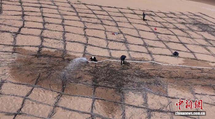(資料圖)圖為工人鋪設草方格沙障。阿拉善宣傳部供圖