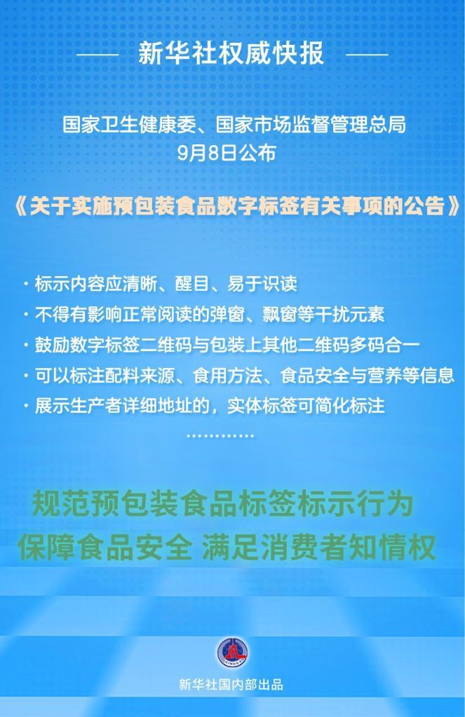 國家衛(wèi)生健康委、國家市場監(jiān)督管理總局9月8日公布《關(guān)于實施預(yù)包裝食品數(shù)字標簽有關(guān)事項的公告》。
