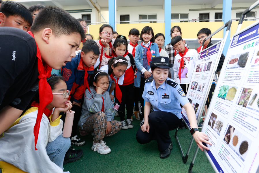 5月26日,浙江省岱山縣公安局民警來(lái)到轄區(qū)蓬山小學(xué)開(kāi)展“共建無(wú)毒家園 守護(hù)紅色根脈”主題宣傳活動(dòng)。其間,民警向?qū)W生講解了植物類、食品飲料類及其他類18種國(guó)家實(shí)行整類列管的新精神活性物質(zhì)相關(guān)知識(shí),并開(kāi)展禁毒拼圖、擊碎毒品等互動(dòng)游戲,進(jìn)一步提高學(xué)生們識(shí)毒、防毒、拒毒意識(shí)。圖為民警向?qū)W生講解禁毒知識(shí)。