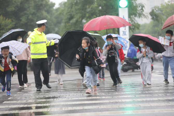 5月19日下午,安徽省舒城縣降雨并伴有霧天氣,舒城縣公安局交通管理大隊在學(xué)校周邊增派“護(hù)學(xué)崗”警力,確保學(xué)生出行安全。圖為該大隊二中隊“護(hù)學(xué)崗”輔警在轄區(qū)一學(xué)校附近呵護(hù)放學(xué)小學(xué)生安全過馬路。