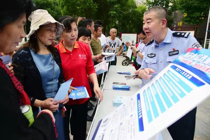 6月3日,江蘇省鎮(zhèn)江市和平路街道征潤州社區(qū)聯(lián)合和平路派出所民警和銀行工作人員,開展“防電信金融詐騙”宣傳進(jìn)社區(qū)活動(dòng),向居民傳授防電信與金融詐騙相關(guān)知識(shí),支招防詐騙策略與技能。圖為民警向居民宣講防電信詐騙相關(guān)知識(shí)。