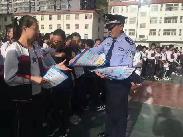 在“6·26”國際禁毒日即將到來之際,陜西省富縣公安局城關派出所民警進學校開展禁毒宣傳。圖為6月18日,民警向學生發(fā)放宣傳資料、宣講禁毒法規(guī)。