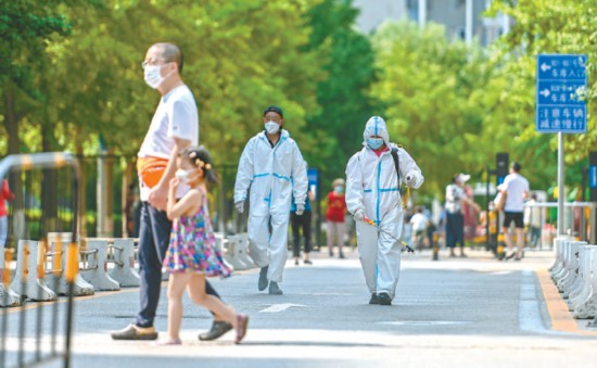 望京國風(fēng)上觀小區(qū)因疫情被封閉后,小區(qū)內(nèi)居民生活秩序井然。圖為物業(yè)組織消殺隊對小區(qū)進(jìn)行防疫消殺工作。 記者 潘之望攝