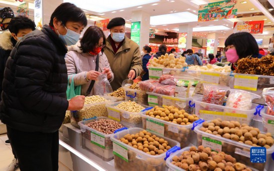 1月28日,市民在位于上海南京東路步行街上的三陽南貨店內(nèi)選購食品。