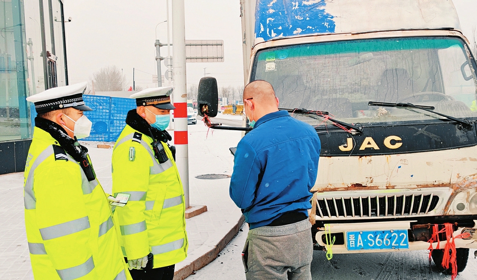 由于連日下雪,為有效預(yù)防道路交通事故的發(fā)生,太原鐵路公安處交警支隊(duì)及時(shí)啟動(dòng)惡劣天氣應(yīng)急預(yù)案,全員上崗,積極應(yīng)對(duì)降雪天氣,確保旅客“春運(yùn)”平安出行。圖為1月24日,民警上街排查交通安全隱患。(成鵬攝)