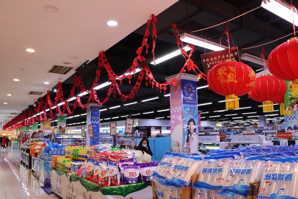 “大華超市沿河店,為迎接春節(jié)的到來,米、面、糧、油、蔬菜、水果等貨物準(zhǔn)備充足,歡迎各位顧客光臨選購?!贝笕A超市沿河店店長彭春說。