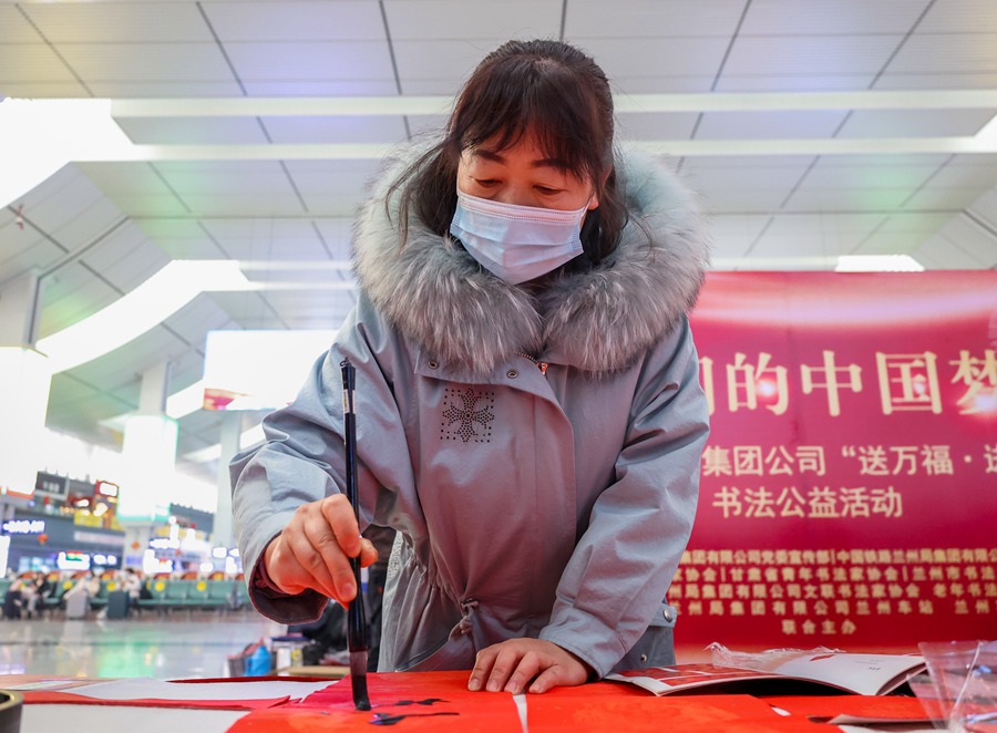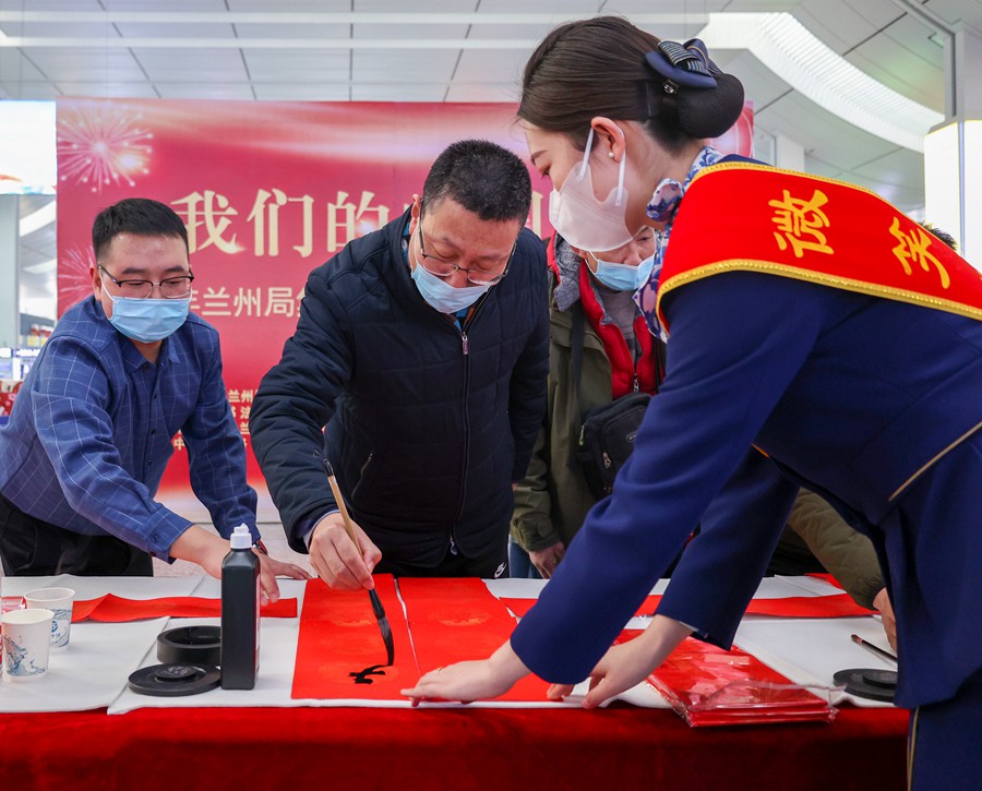 為實(shí)現(xiàn)“平安春運(yùn)、有序春運(yùn)、溫馨春運(yùn),讓旅客體驗(yàn)更美好”的春運(yùn)目標(biāo),1月25日蘭州鐵路局在蘭州火車站、蘭州西站開(kāi)展了以“我們的中國(guó)夢(mèng)”為主題的“送萬(wàn)福·進(jìn)萬(wàn)家”書(shū)法公益活動(dòng)?;顒?dòng)當(dāng)天,甘肅省的20余名書(shū)法家、藝術(shù)家筆走龍蛇、揮毫潑墨,現(xiàn)場(chǎng)創(chuàng)作春聯(lián)和“?!弊?,為候車旅客送上新春的祝福。