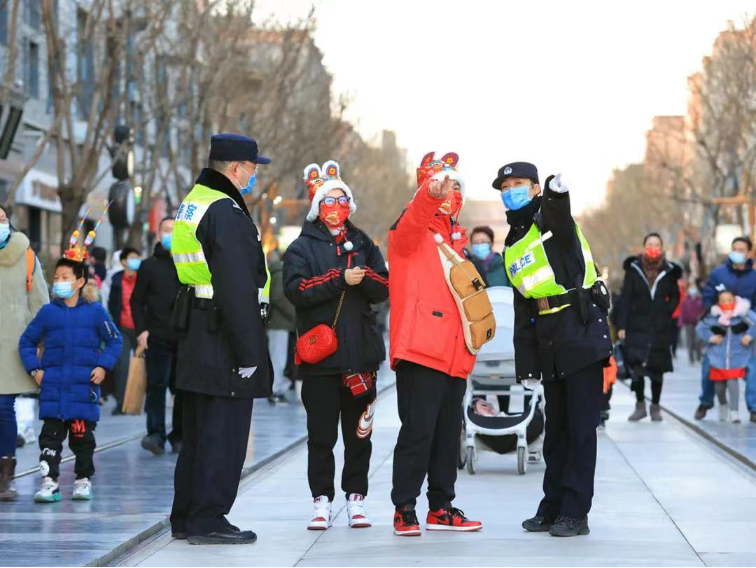 2022年春節(jié)期間,北京市公安局東城分局全體民警堅守崗位,舍小家,為大家,全力保障轄區(qū)安全穩(wěn)定。圖為前門大街派出所民警在轄區(qū)巡邏,隨時為群眾提供幫助。