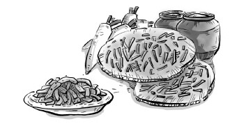 十來天后,母親將僵蟲一般的蘿卜條,放進(jìn)沸水里焯一焯,一來祛除濃烈的生辣味兒,讓蘿卜條變得溫順、和氣一些;二來吸納一定的水分,使其變得滋潤、飽滿。瀝干水分后,母親將蘿卜條一股腦倒進(jìn)盆里,加入細(xì)鹽、五香粉和八角等調(diào)料,然后用雙手?jǐn)噭?,悉?shù)裝入壇子,壓實,封口。