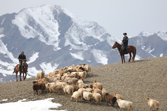近日,隨著氣溫逐步回暖,新疆維吾爾自治區(qū)阿勒泰地區(qū)青河縣的牧民們都陸續(xù)開始了轉(zhuǎn)場作業(yè)。連日來,阿勒泰邊境管理支隊(duì)青河邊境管理大隊(duì)阿尕什敖包邊境派出所選派騎馬經(jīng)驗(yàn)豐富的民警成立“牧羊人”小分隊(duì),深入邊境轄區(qū)幫助牧民們共同放牧,全力保障牧民轉(zhuǎn)場的順利進(jìn)行。圖為民警助力牧民轉(zhuǎn)場。
